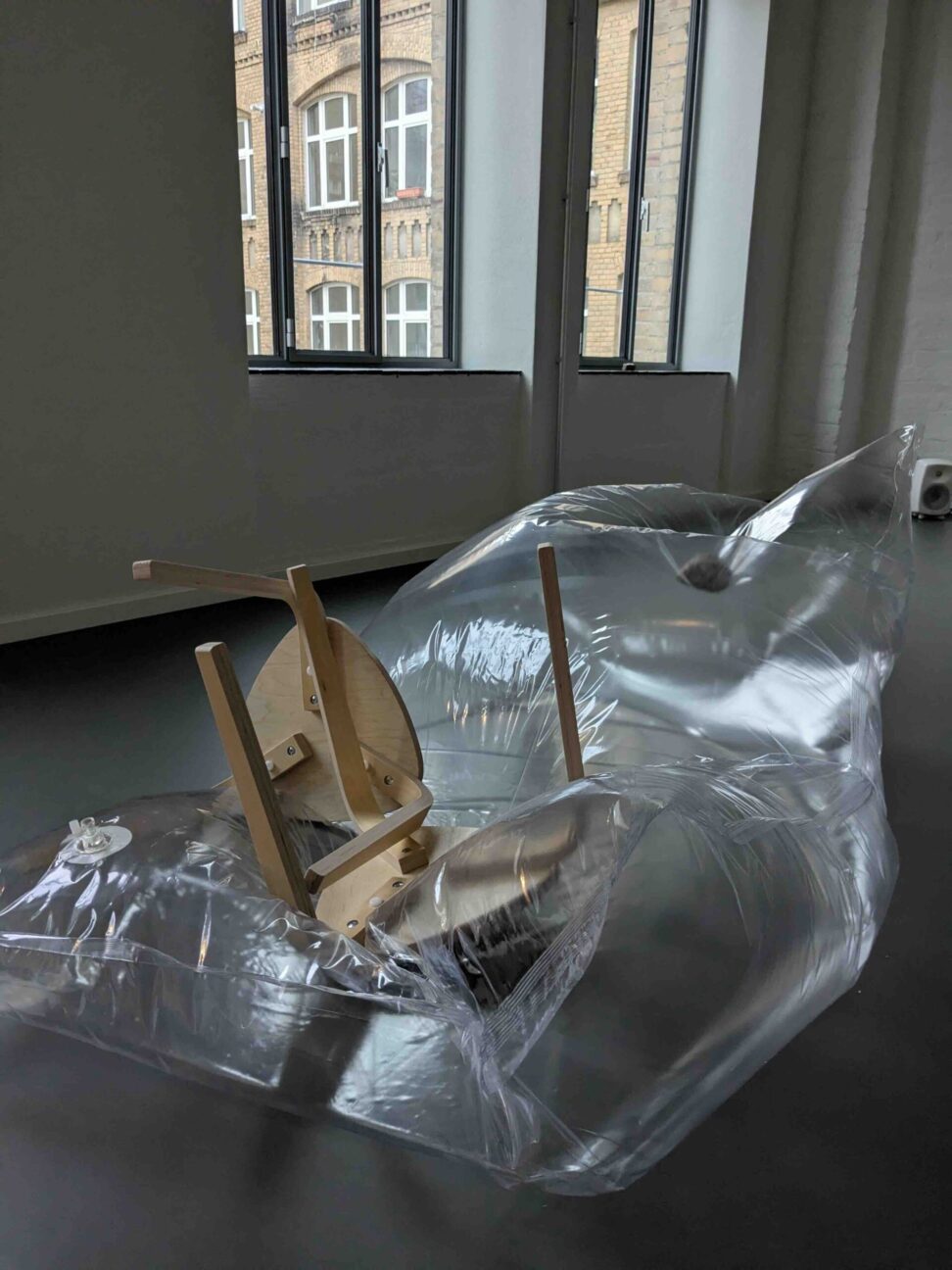 2025年11月の舞台装置のプロトタイプ。本番はこのエアベッドの下にアクチュエーターを設置して、ベッドの上に置いた石たちを落とすために上下させた。