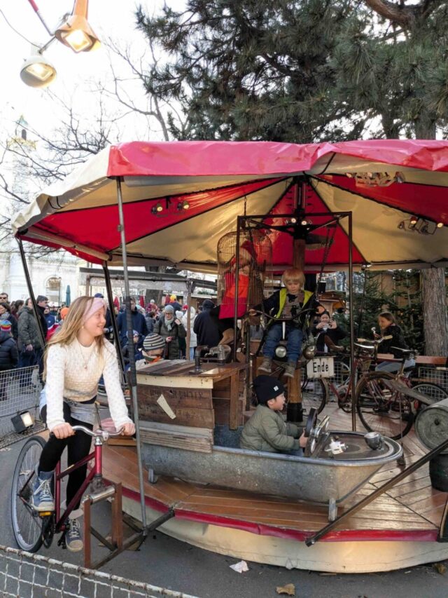 2025年12月のウィーンのあるクリスマスマーケットで。手前左側の自転車ともう2台で動かすメリーゴーラウンド。料金払ってペダルを踏んで風景をぶん回す仕様。