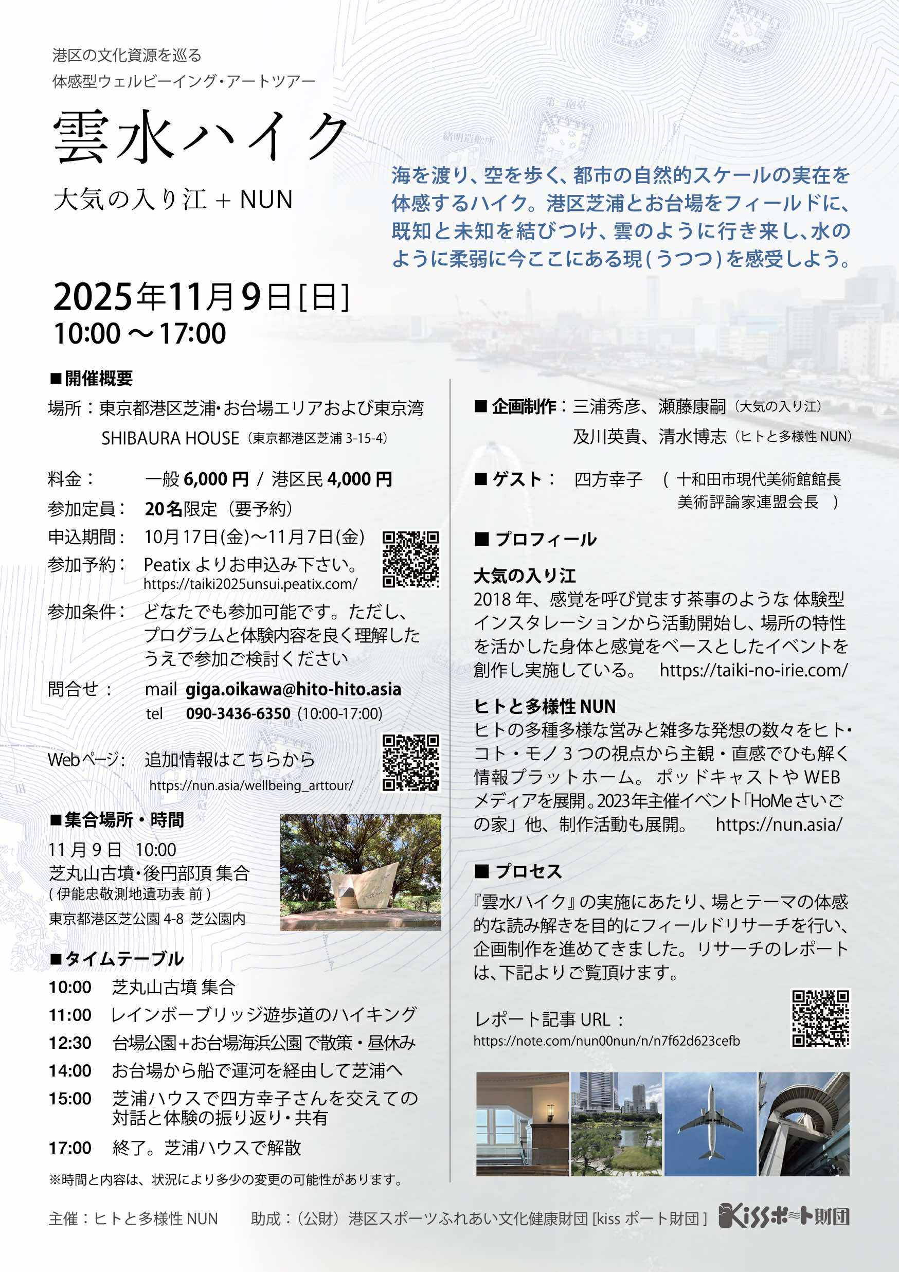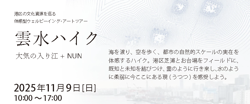 海を渡り、空を歩く、都市の自然的スケールの実在を体感するハイク。港区芝浦とお台場をフィールドに、既知と未知を結びつけ、雲のように行き来し、水のように柔弱に今ここにある現( うつつ) を感受しよう。